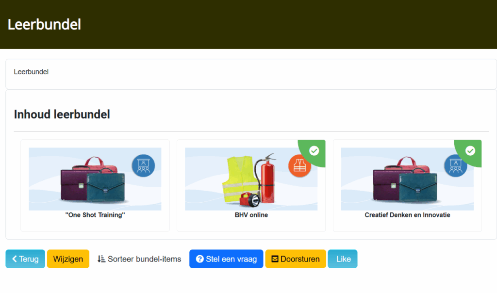 Heb je alle items in de bundel afgerond? Dan verschijnt er ook een groen vinkje op de tegel van de bundel in de catalogus. Zo zie je in één oogopslag dat je de hele bundel hebt afgerond.