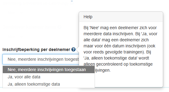 Ja, voor alle data ➤ De deelnemer mag zich slechts één keer inschrijven voor een planitem dat bij dit catalogusitem hoort, ongeacht de datum. Dit voorkomt dubbele inschrijvingen.